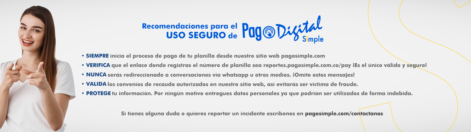 Te damos la bienvenida a nuestra alternativa de pago en línea de tu planilla Simple de aportes a seguridad social. Ten a la mano el número de referencia/PIN y asegúrate de comprobar que la información esté correcta antes de realizar el pago.